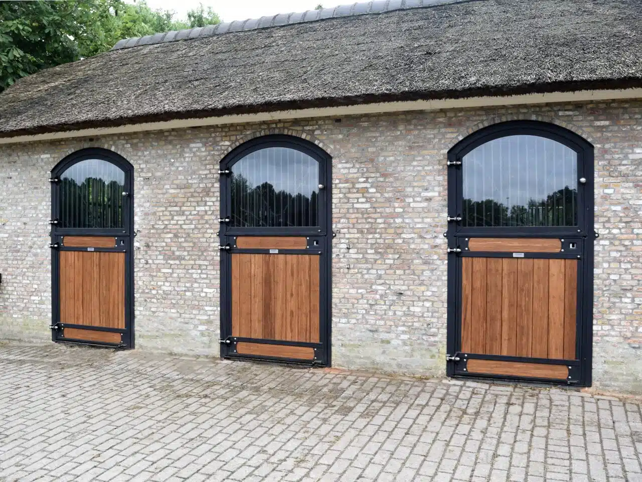 Alliant élégance et sécurité, la porte de box vitrée à deux battants constitue une solution idéale pour les boxes donnant sur l’extérieur. Son vitrage en verre feuilleté apporte une luminosité naturelle tout en conservant un haut niveau de protection pour les chevaux.