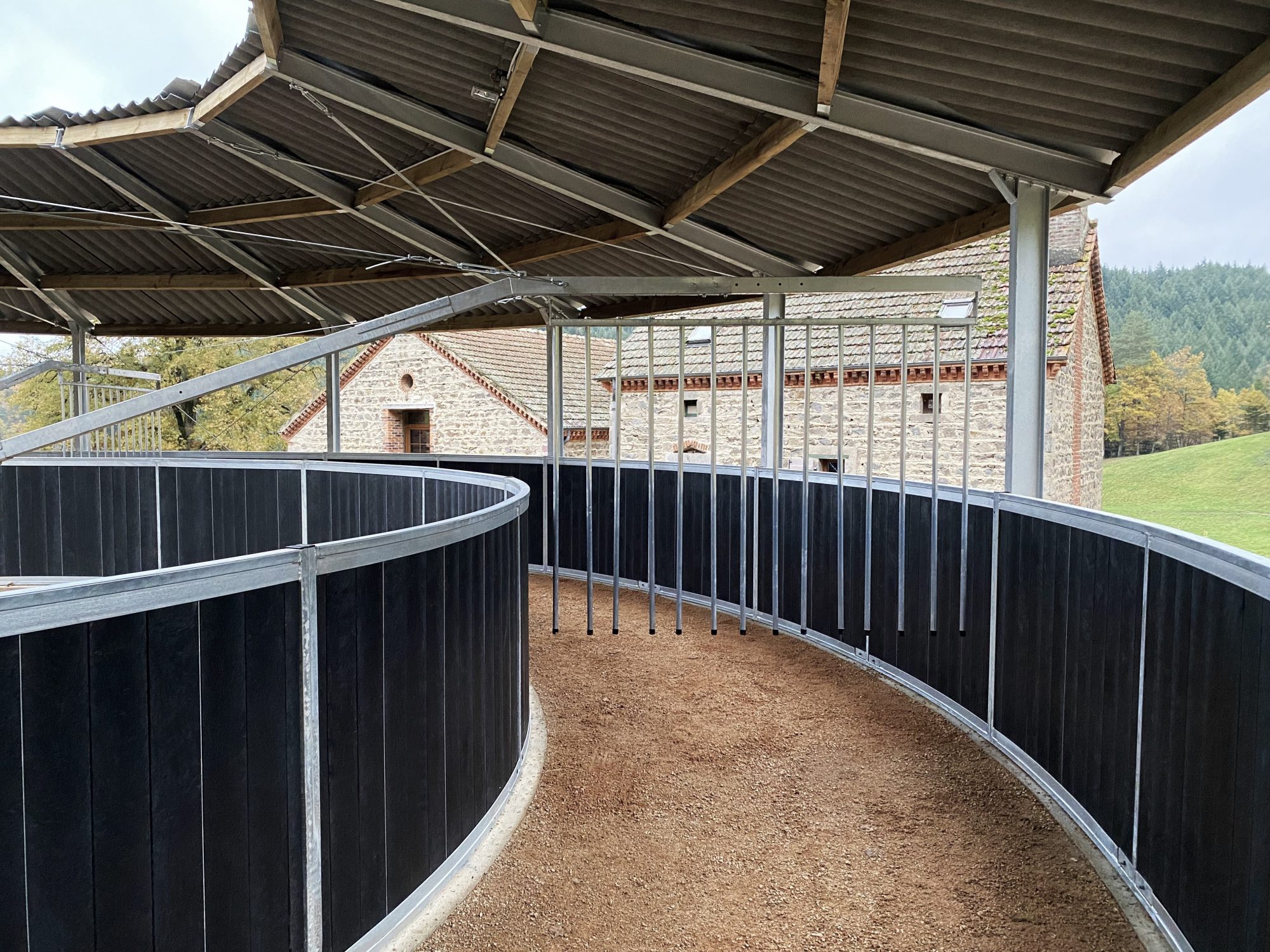 Située en Auvergne, au sud de Clermont-Ferrand, une charmante écurie privée de chevaux de sport abrite un marcheur de Ø15 destiné à quatre chevaux. Ce marcheur, équipé d’une toiture de piste et d’un filet brise-vent, garantit une protection optimale et les chevaux peuvent ainsi sortir toute l’année, quelle que soit la saison.