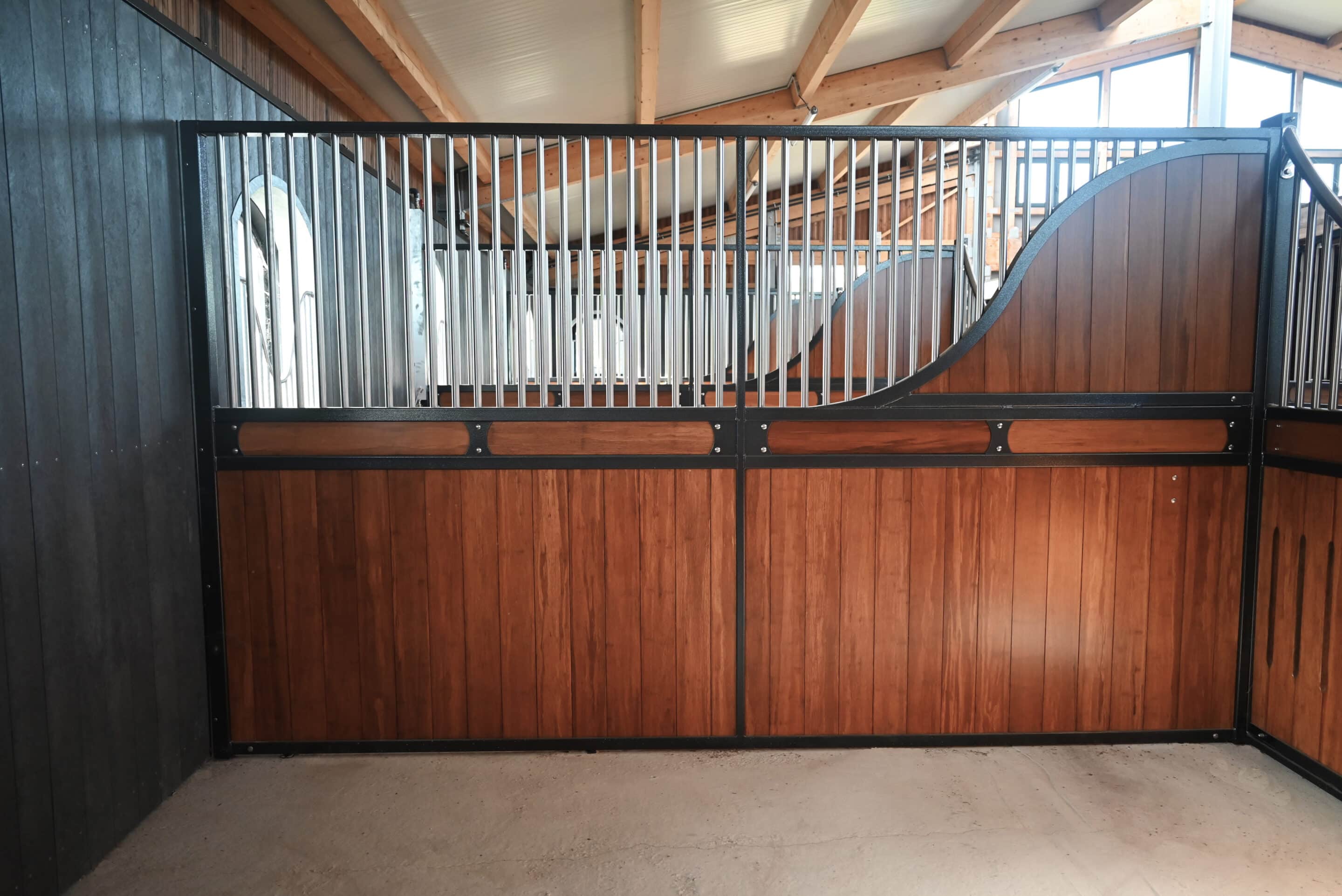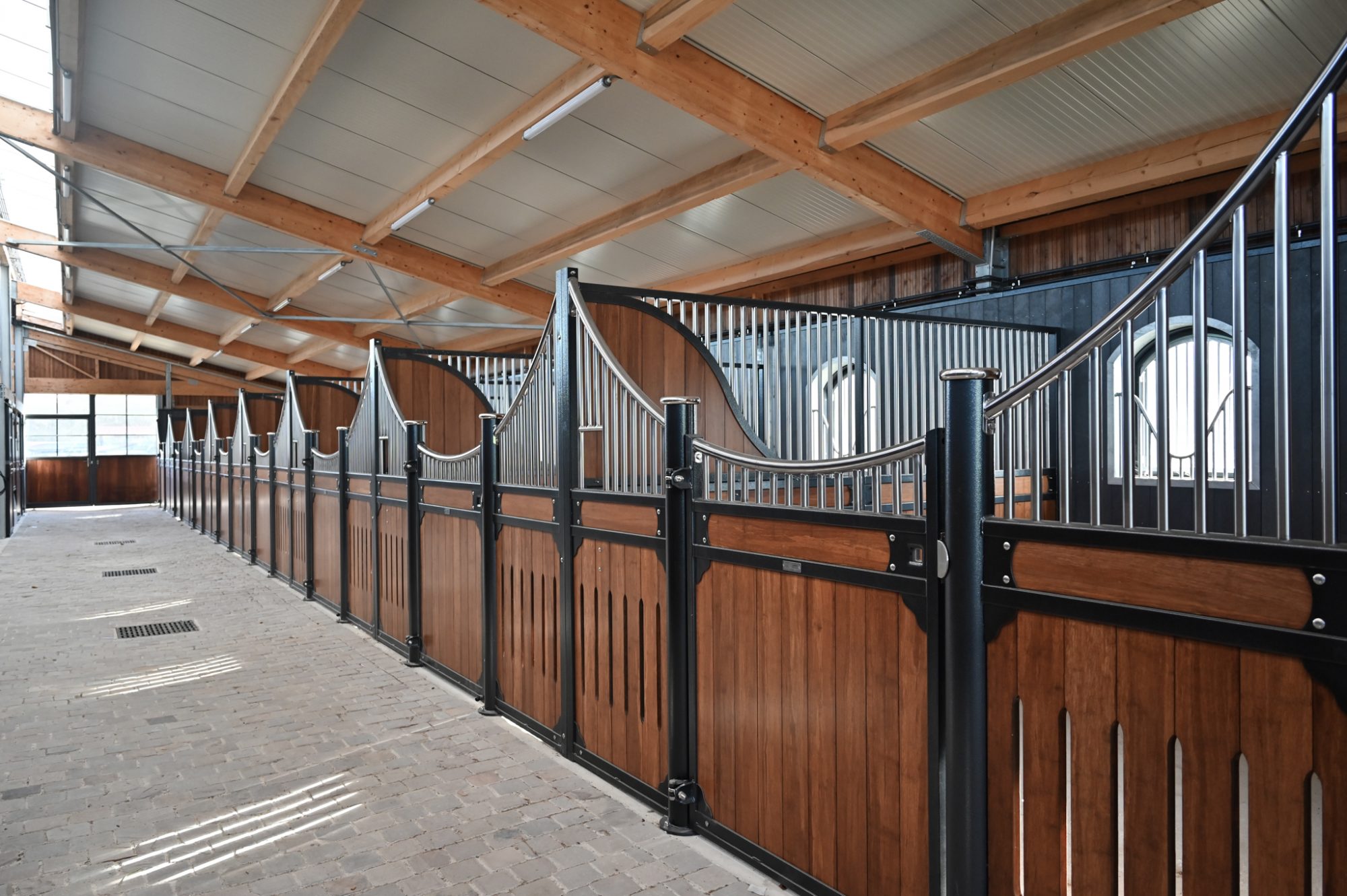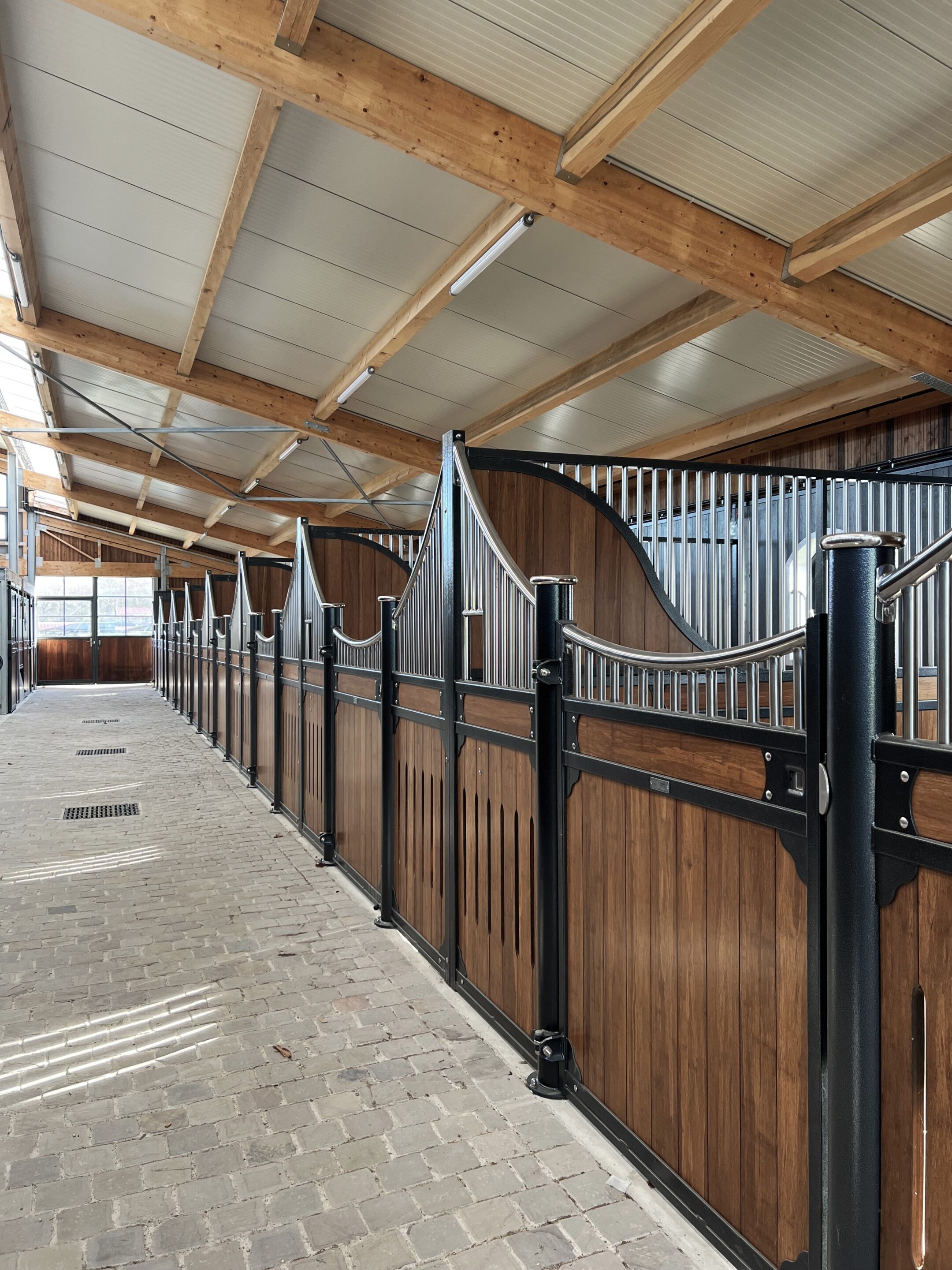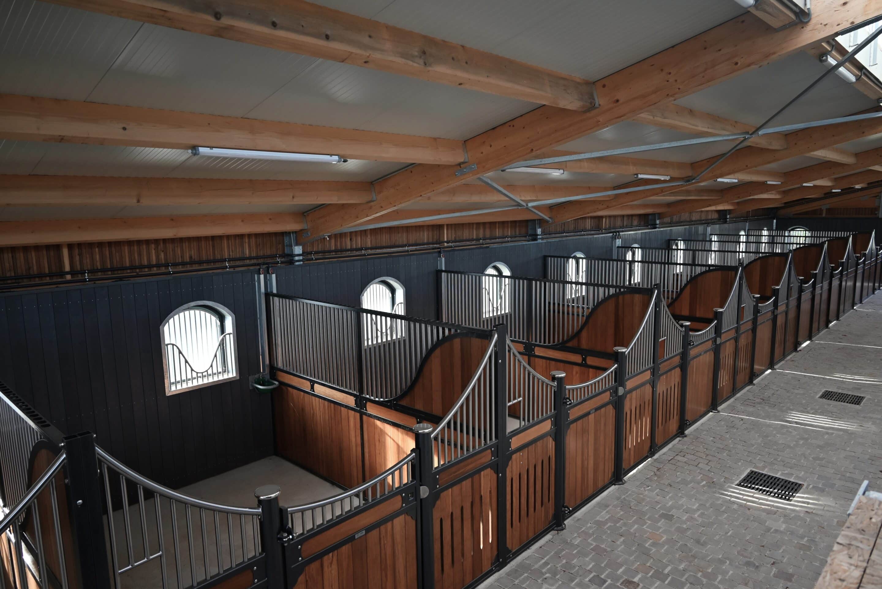 L’écurie compte 22 boxes spacieux (3,5 x 4 m et 4 x 4m). Les façades Classic Wave et Windsor ont été choisies, avec planches en bambou, peinture gris martelé et barreaux en inox. Les planches intègrent des fentes de ventilation pour une finition harmonieuse.