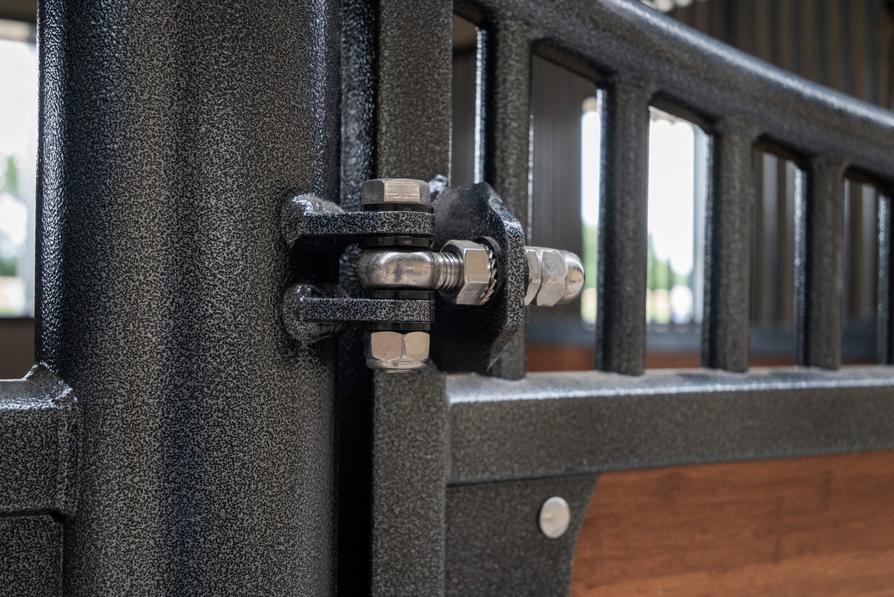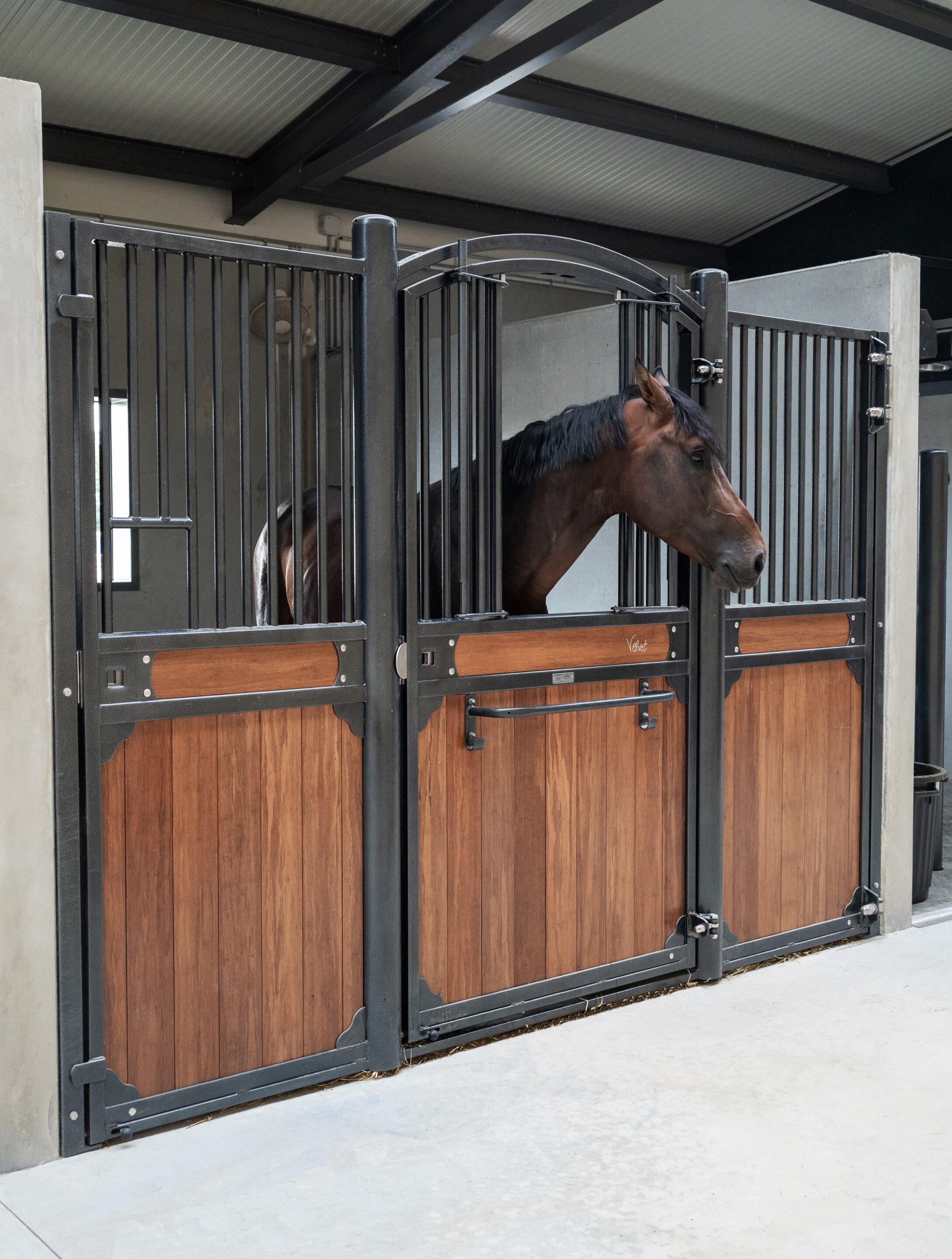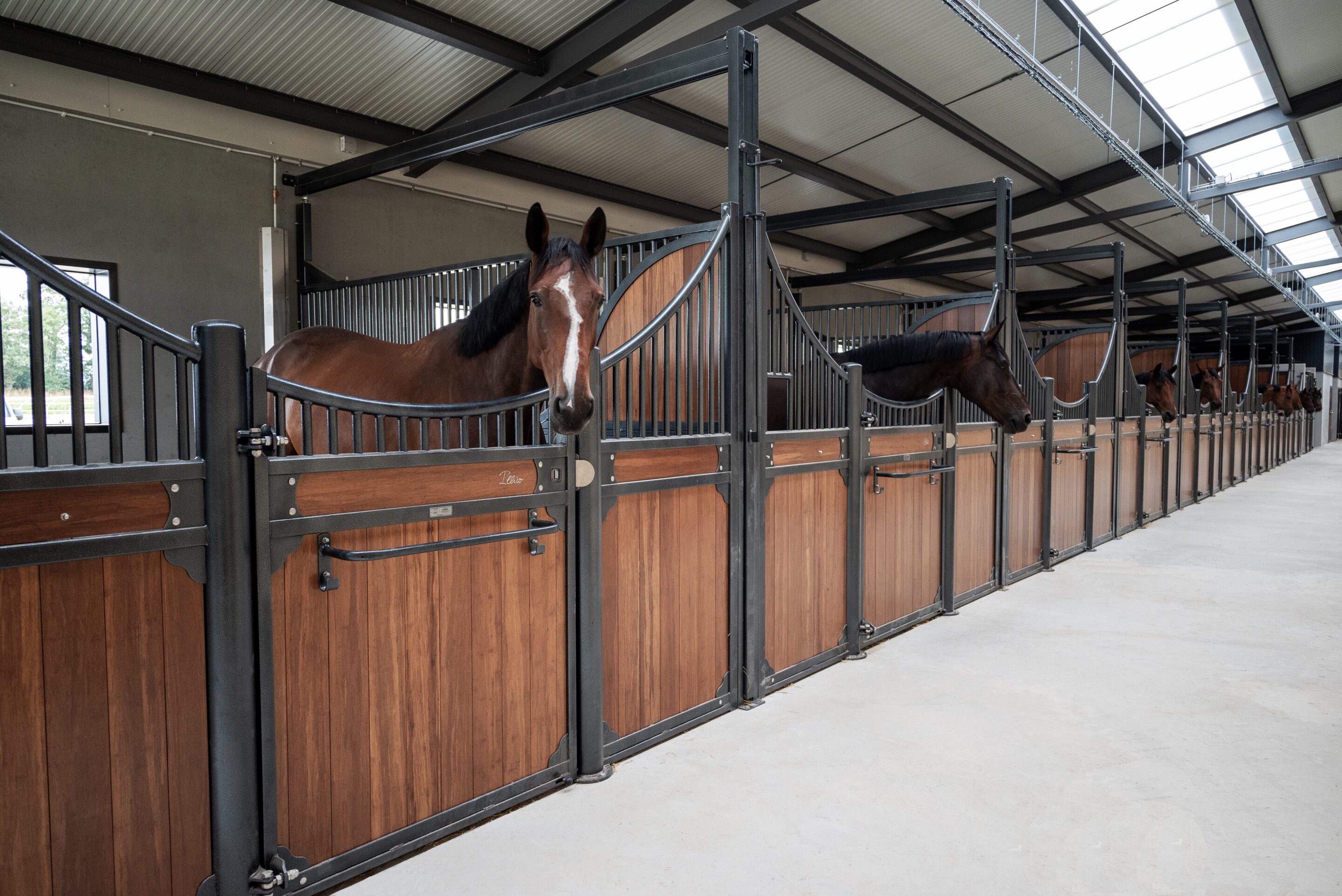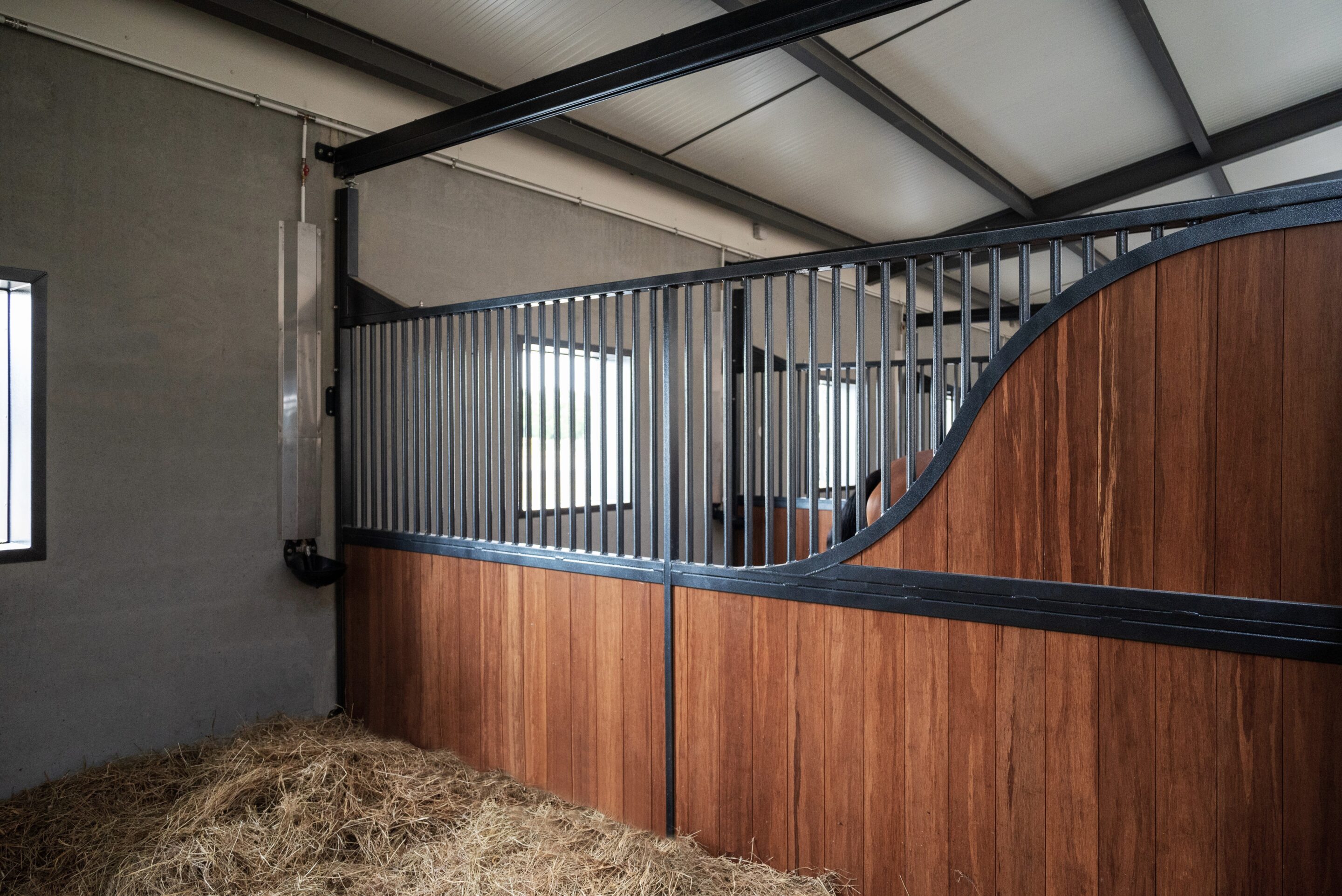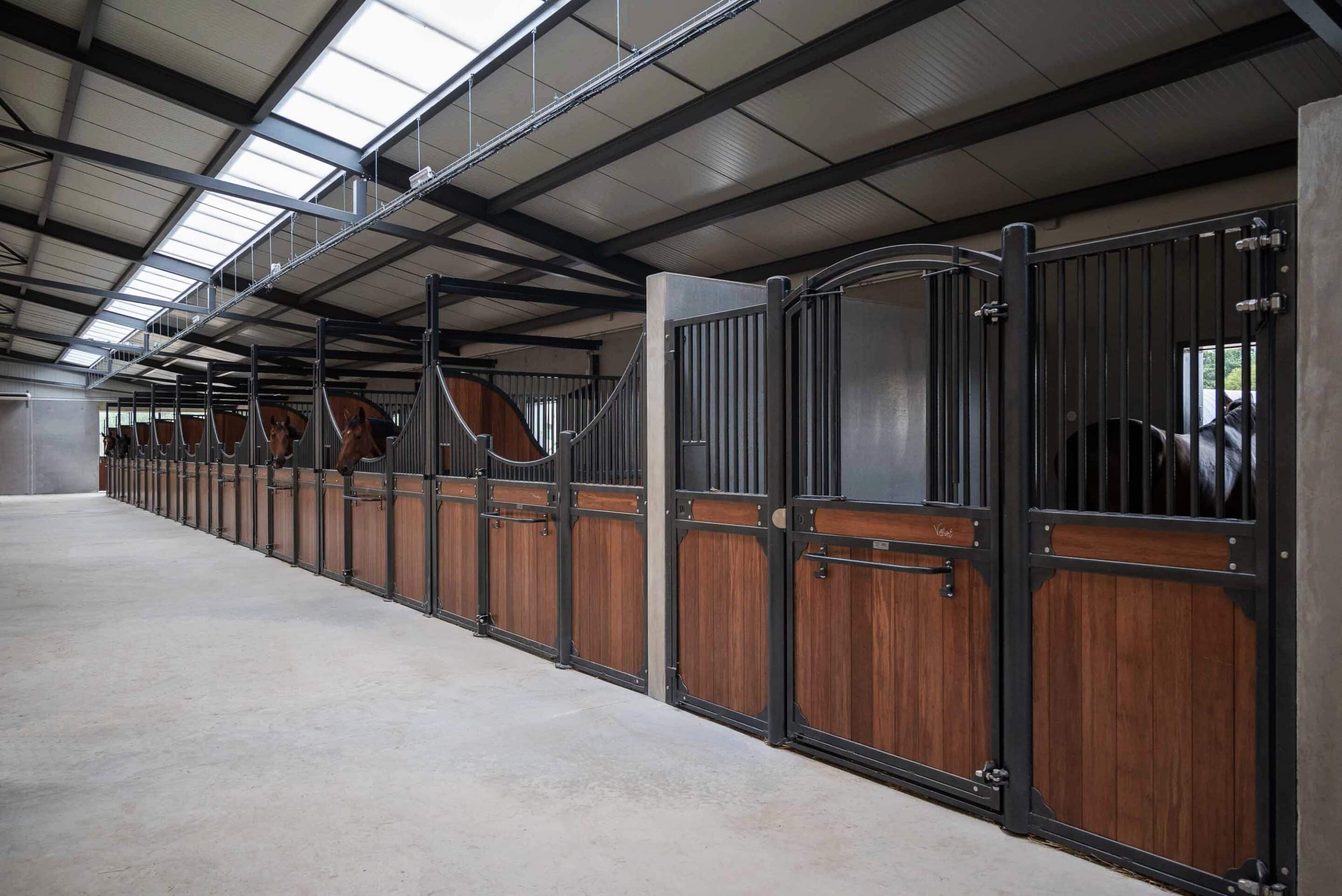L’écurie compte 10 boxes de 3,5 m x 4 m majoritairement équipés du modèle Classic Wave, avec une exception pour un box en façade haute Windsor.