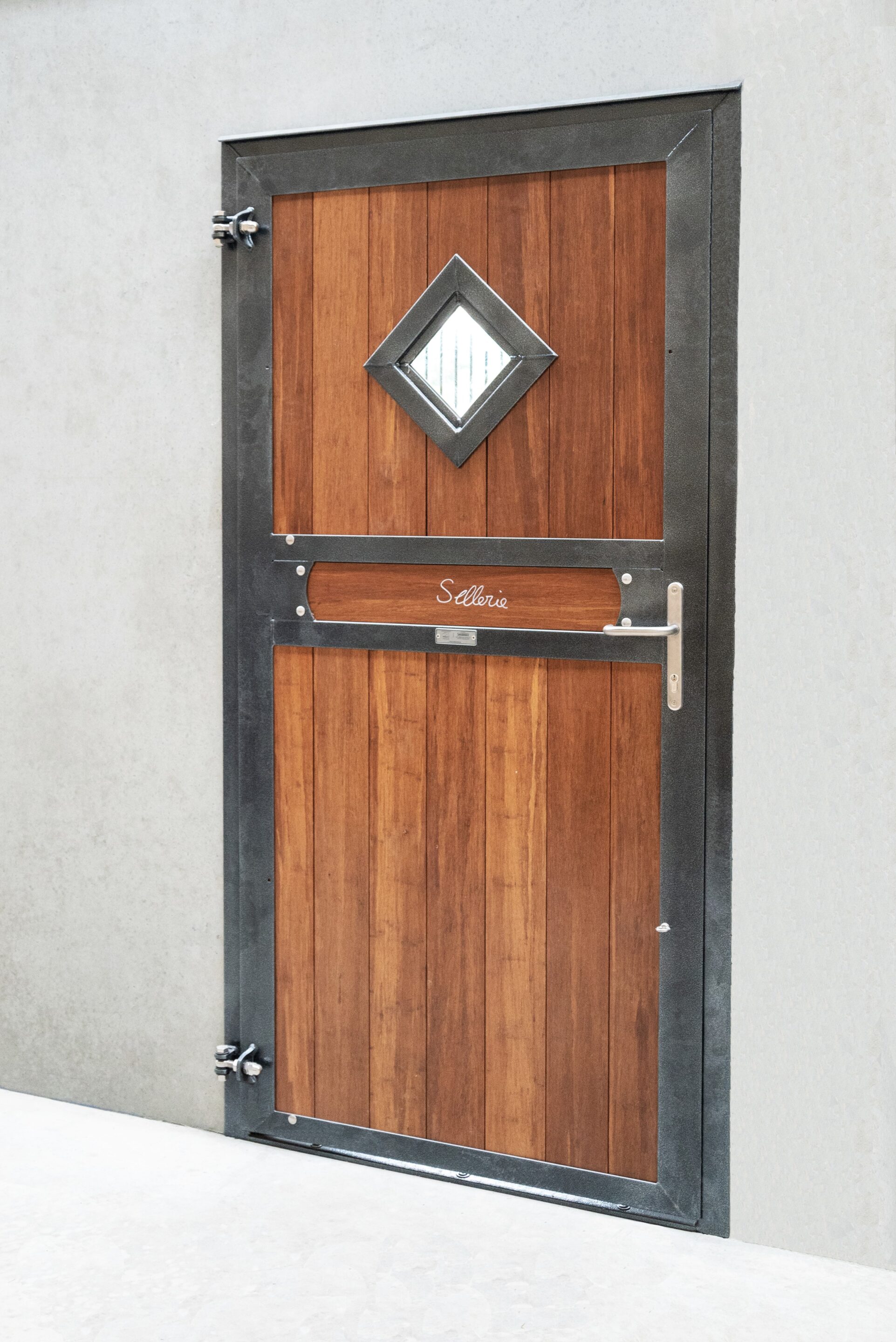 - Portes d’écurie coulissantes vitrées (planches en bambou, bandeau horizontal, croix dans vitrage, serrure & peinture thermolaquée coloris gris texturé)