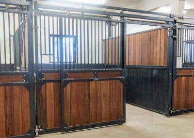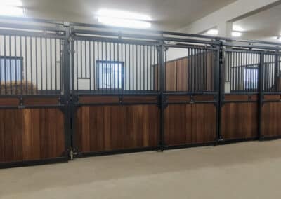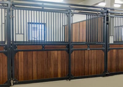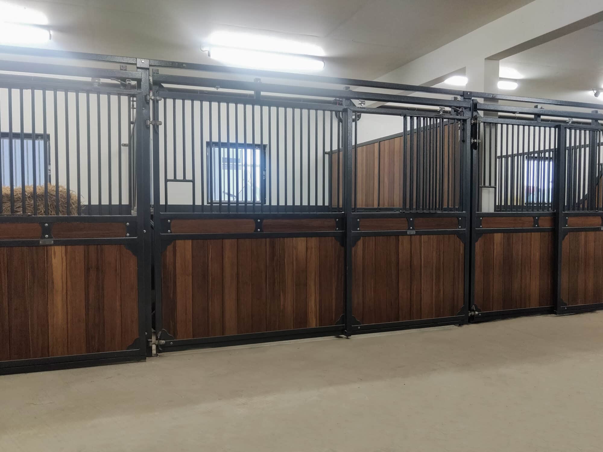Nous avons eu le plaisir d’aménager cette magnifique écurie en y installant 16 boxes de 3,2 x 3,5 m, avec le modèle Sport-Line choisi pour sa simplicité d’utilisation et son efficacité ainsi que des cloisons pleines et semi-fermées. Nos clients ont également souhaité des options et finitions personnalisées pour un résultat esthétique optimal. Nous avons également équipé l’écurie et le manège de grandes portes vitrées pour apporter de la luminosité.